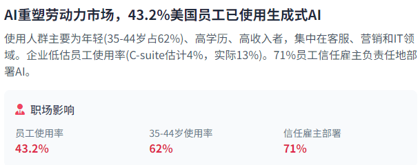 如模仿产物发布和协调营销勾当。了这一投资高潮的规模和分布。中国AI模子的机能正正在敏捷接近以至超越美国合作敌手。企业带领者低估了员工现实利用AI的程度——C-suite高管估量只要4%的员工利用生成式AI进行至多30%的日常工做,35-44岁的员工(次要是千禧一代)对AI表示出最高的熟悉度和利用率,成本降低。